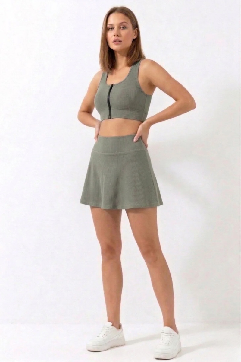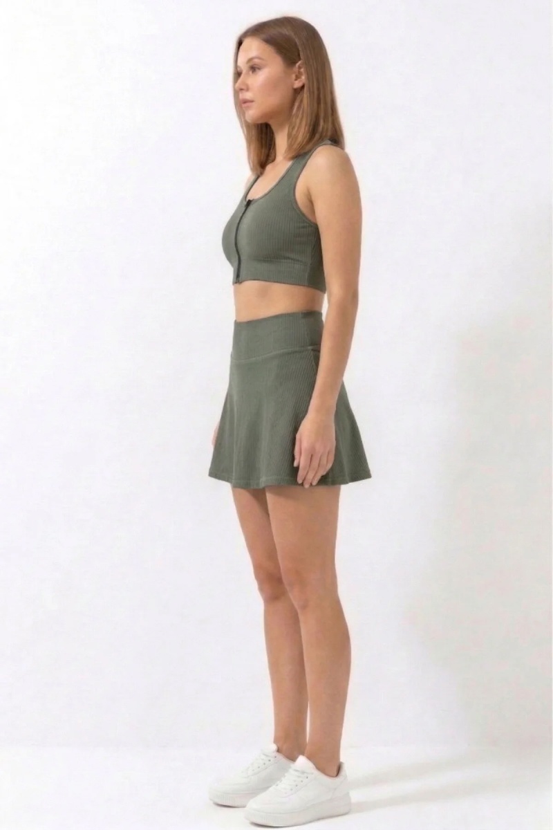 EMFURE Haki Yüksek Bel Çift Katmanlı Mini Etek Tenis Eteği ve Fermuarlı Büstiyer Crop Takım