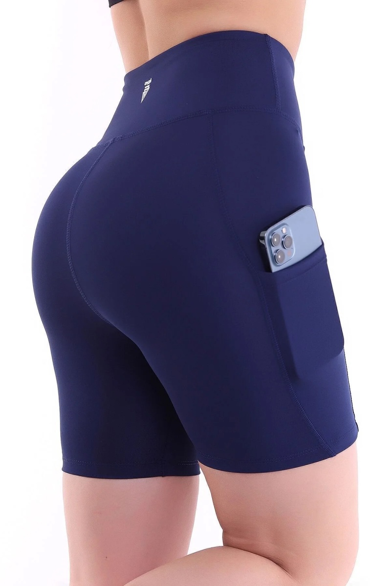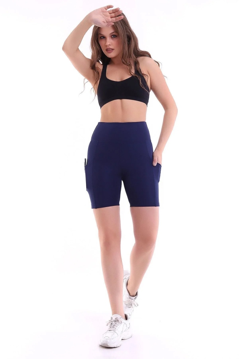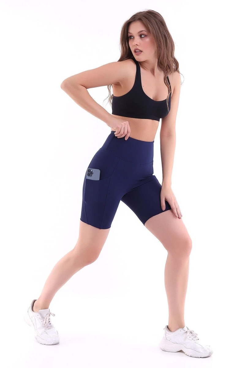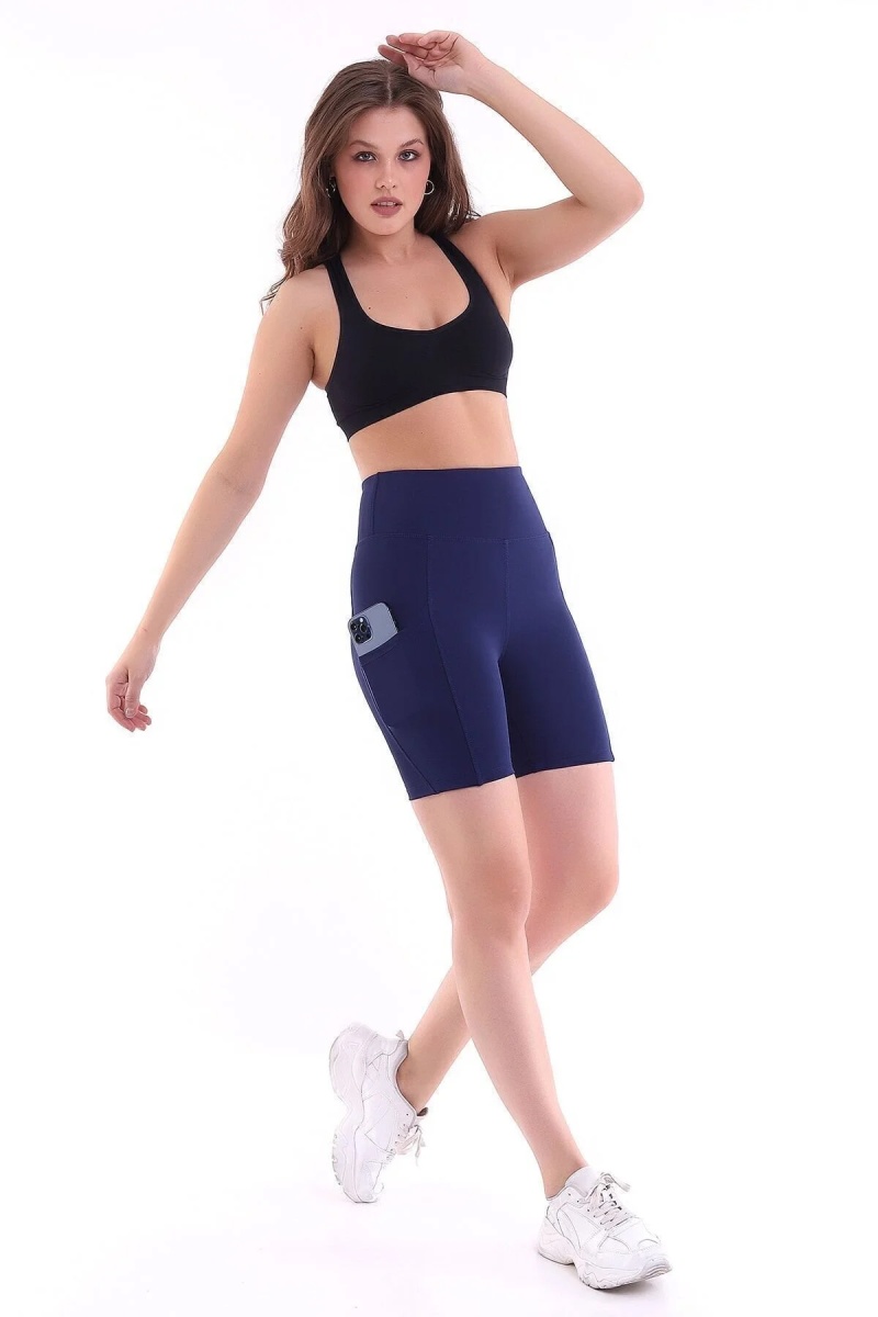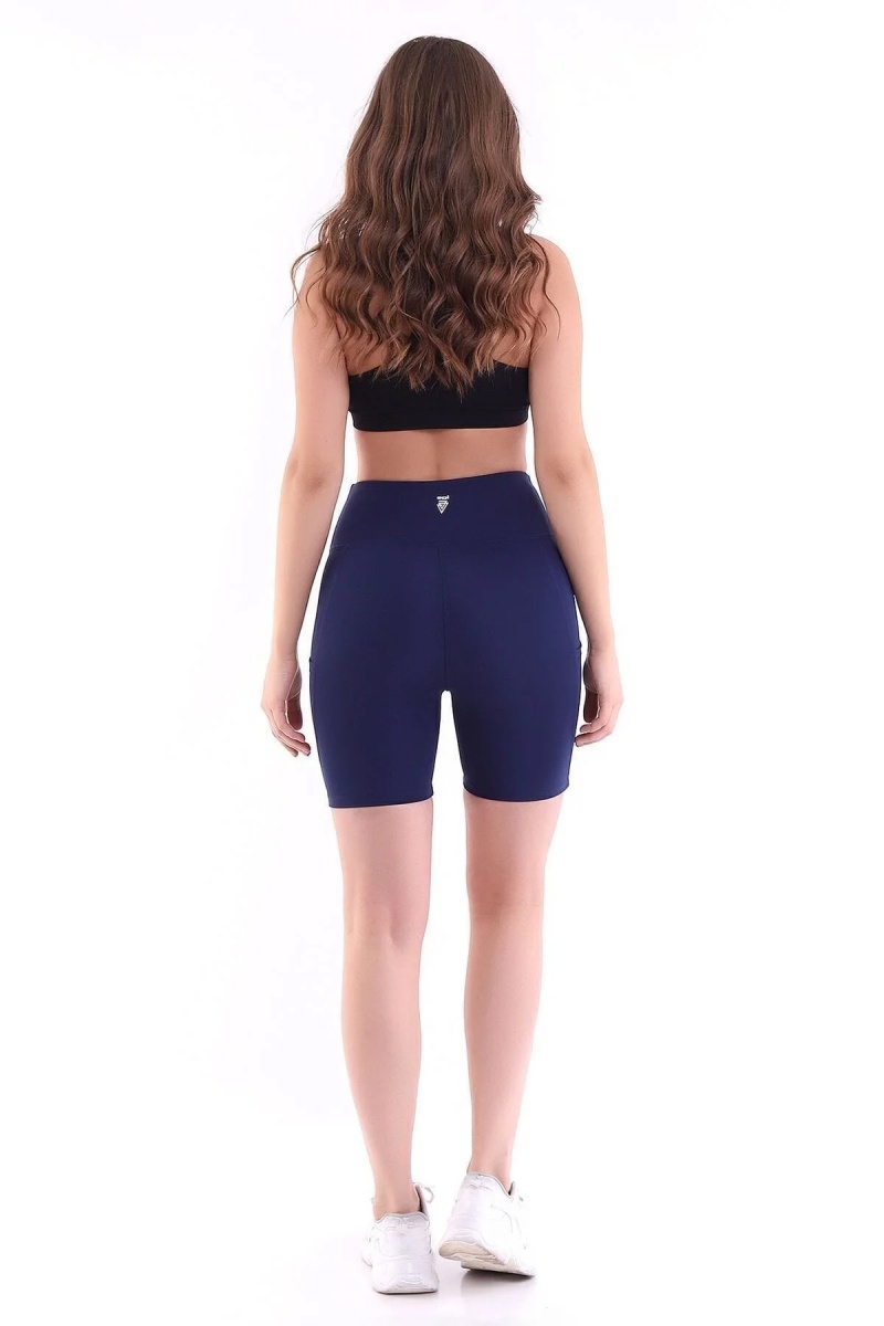- Lacivert rengiyle şıklığı ve spor şıklığını bir arada sunan kısa tayt, günlük kullanım için idealdir.