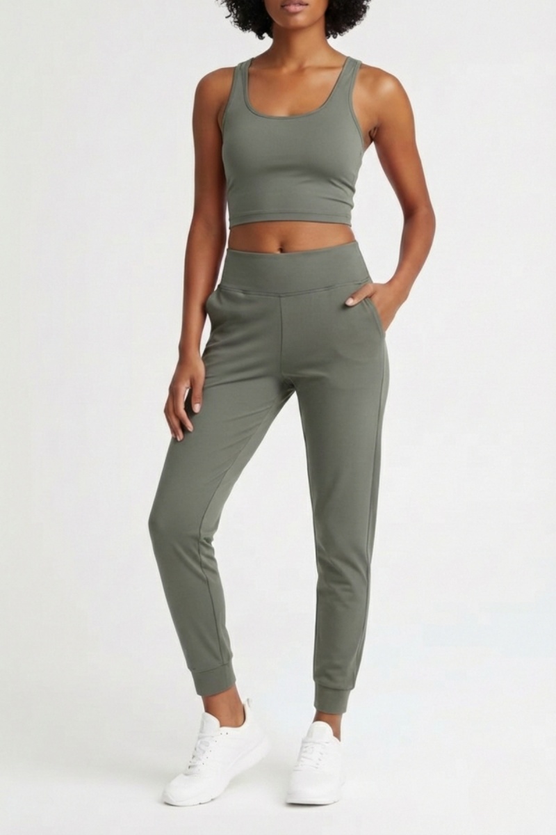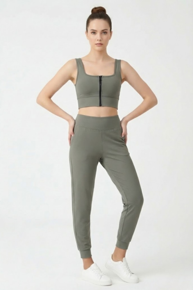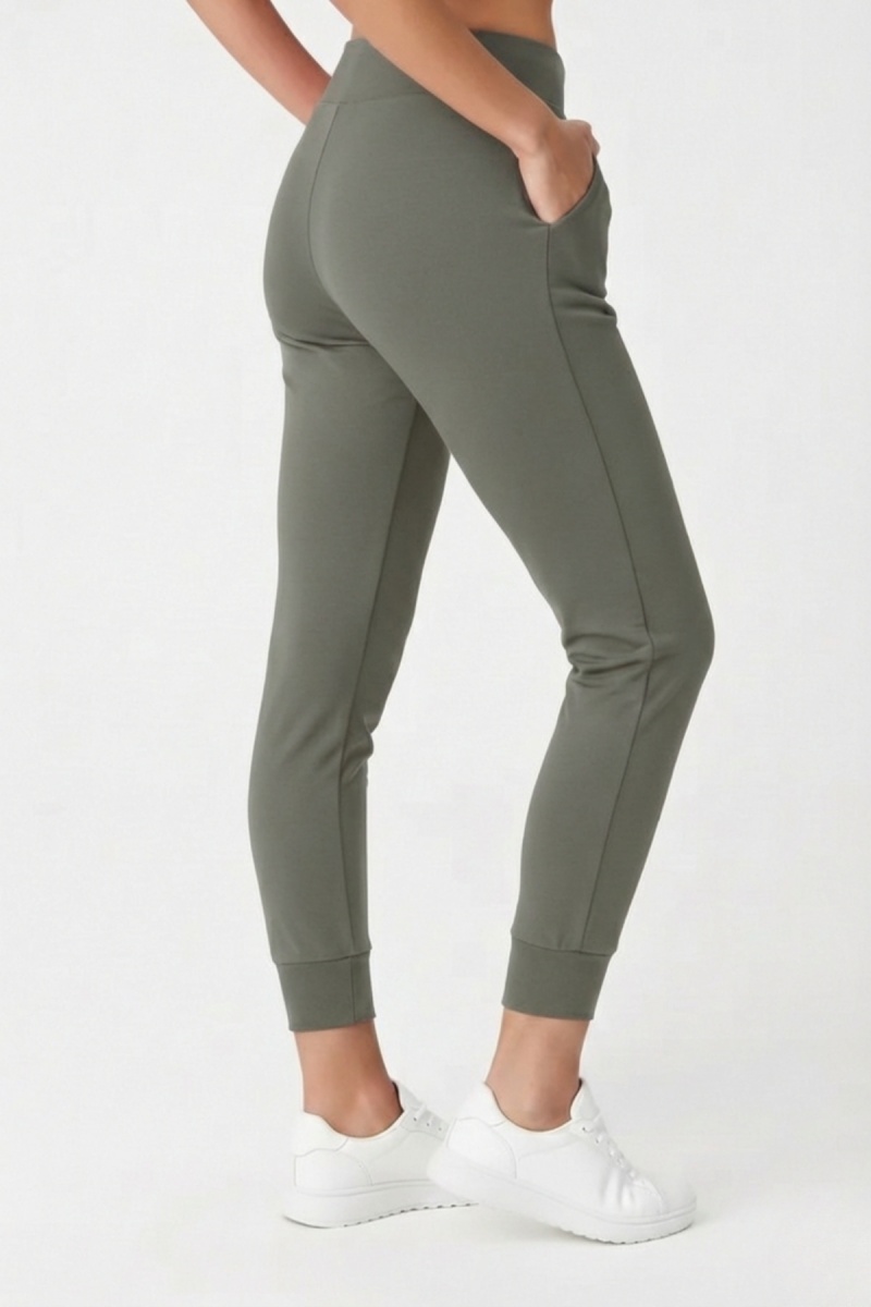 Kadın Haki Çift Cepli Yüksek Bel Lastikli Rahat Kesim Jogger Eşofman Altı