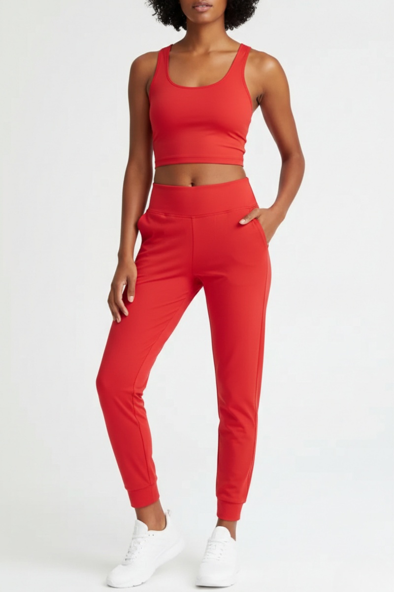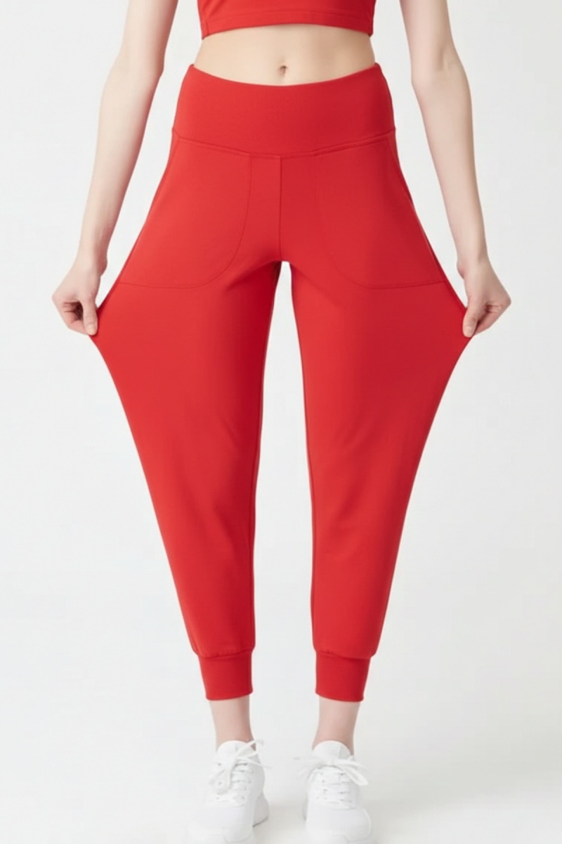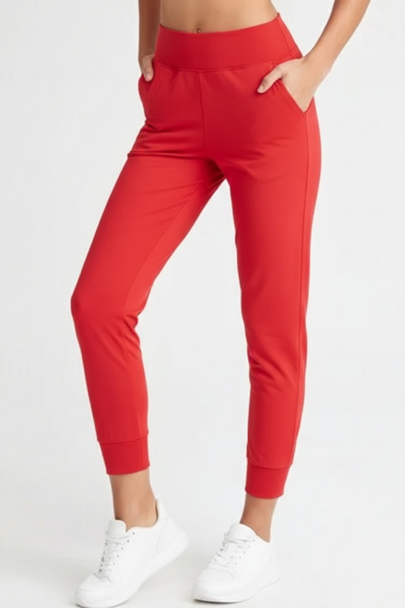 Kadın Kırmızı Çift Cepli Yüksek Bel Lastikli Rahat Kesim Jogger Eşofman Altı