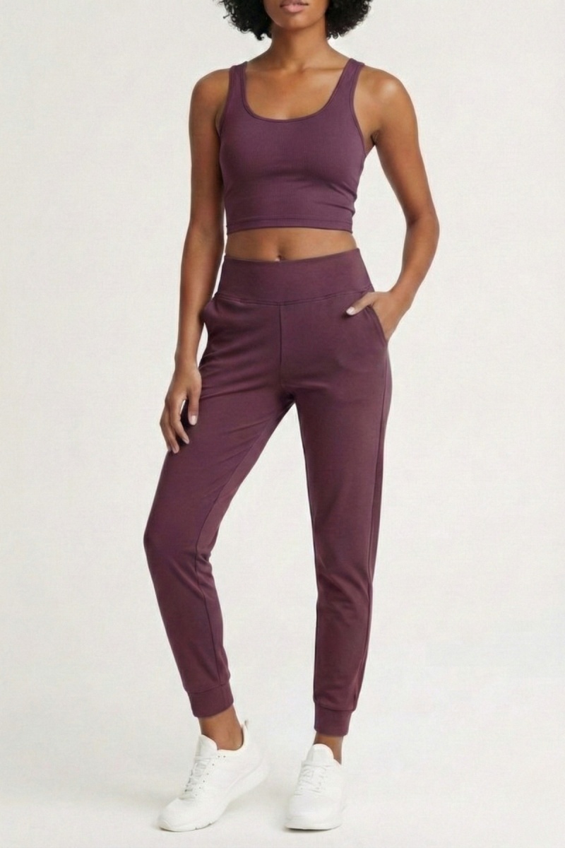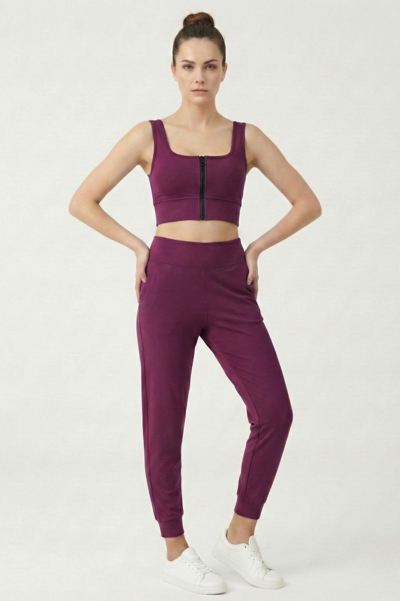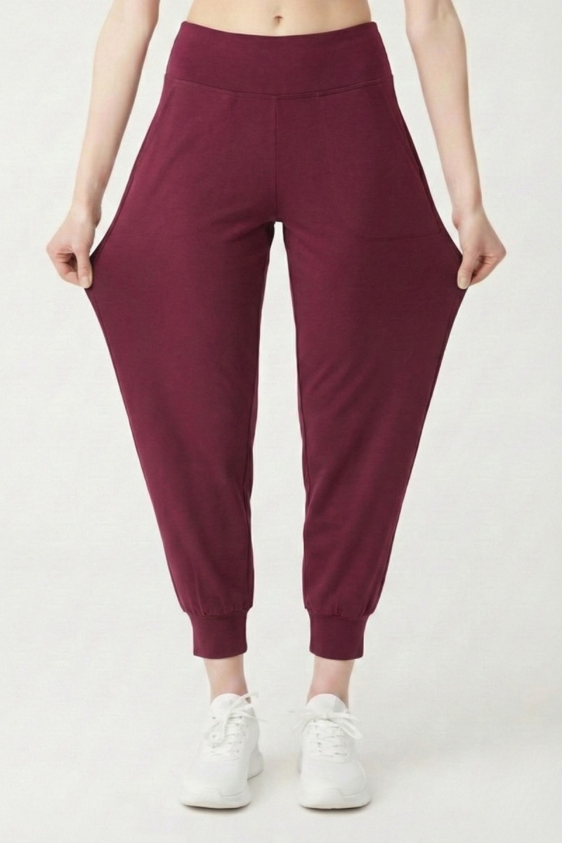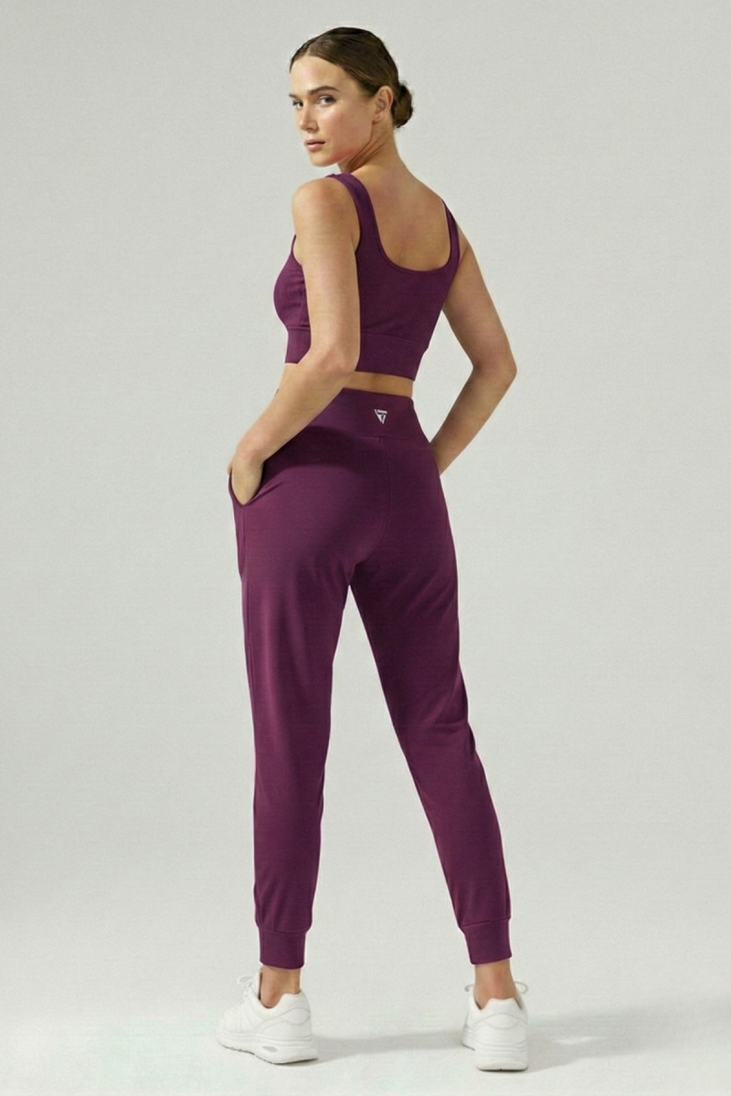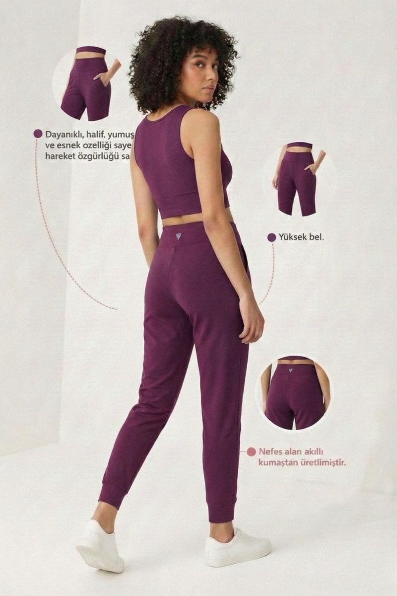 Kadın Mürdüm Çift Cepli Yüksek Bel Lastikli Rahat Kesim Jogger Eşofman Altı