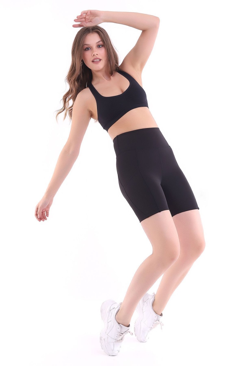 Kadın Siyah Yüksek Bel Toparlayıcı Çift Cepli Biker Şort Kısa Spor Tayt Biker Shades