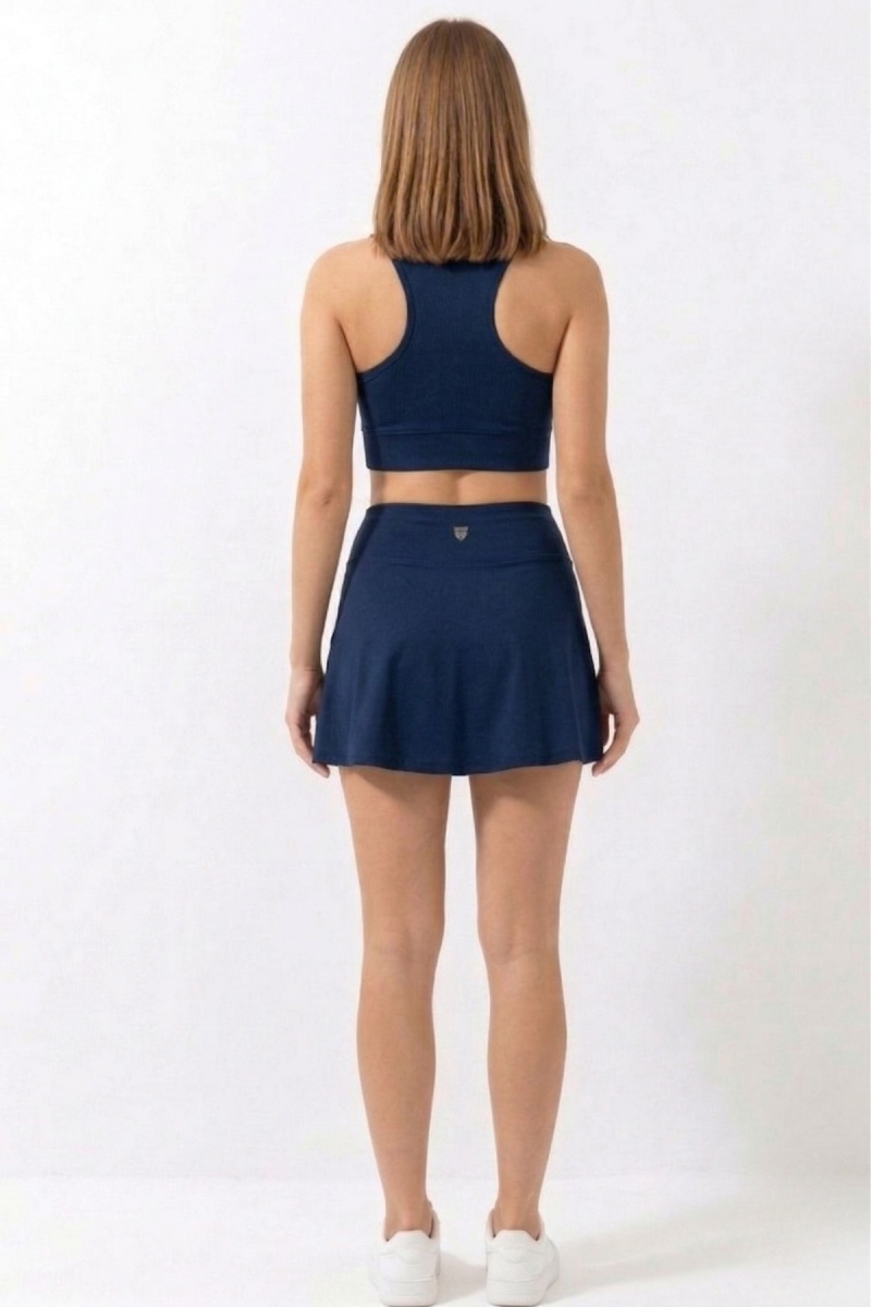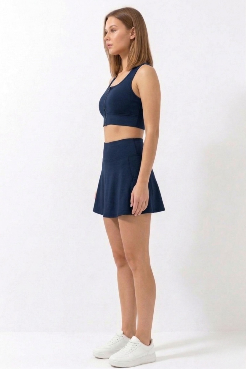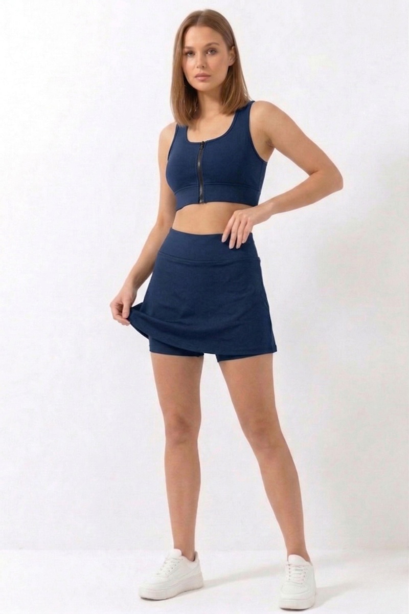 Lacivert Yüksek Bel Çift Katmanlı Mini Etek Tenis Eteği ve Fermuarlı Büstiyer Crop Takım